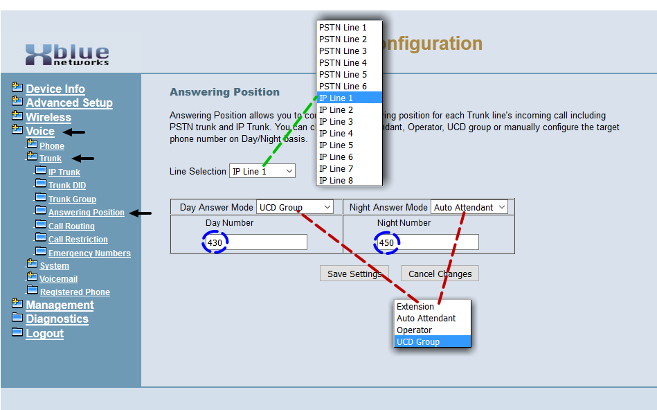 3. Use the pull-down at Line Selection to select IP Line 1 (this is the first registered IP Trunk). The current settings for this Line are then shown.