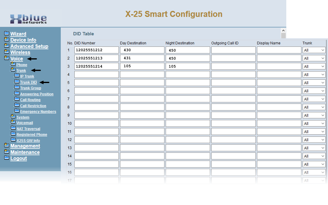 More on DID’s: Direct Inward Dial numbers are other numbers that can be used with your service. In the example the main service number is 12025551212… you might also have 12025551213 and …14 etc. DID’s are numbers that other people dial to reach certain people in your office on the XBLUE system. The XBLUE servers (X25 & X50) each can handle up to 50 DID’s.