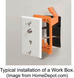 Work Boxes are used to install both high and low voltage connectors and devices onto or into drywall.