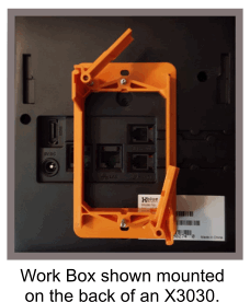 Note that the power supply plug is not within the Work Box opening. As a result, power for the phone must come from a PoE source rather than the plug-in power adapter that comes with the X3030 phone. It is possible to use the plug-in power adapter with use of a surface mount Work Box and by installing the phone near an AC outlet.